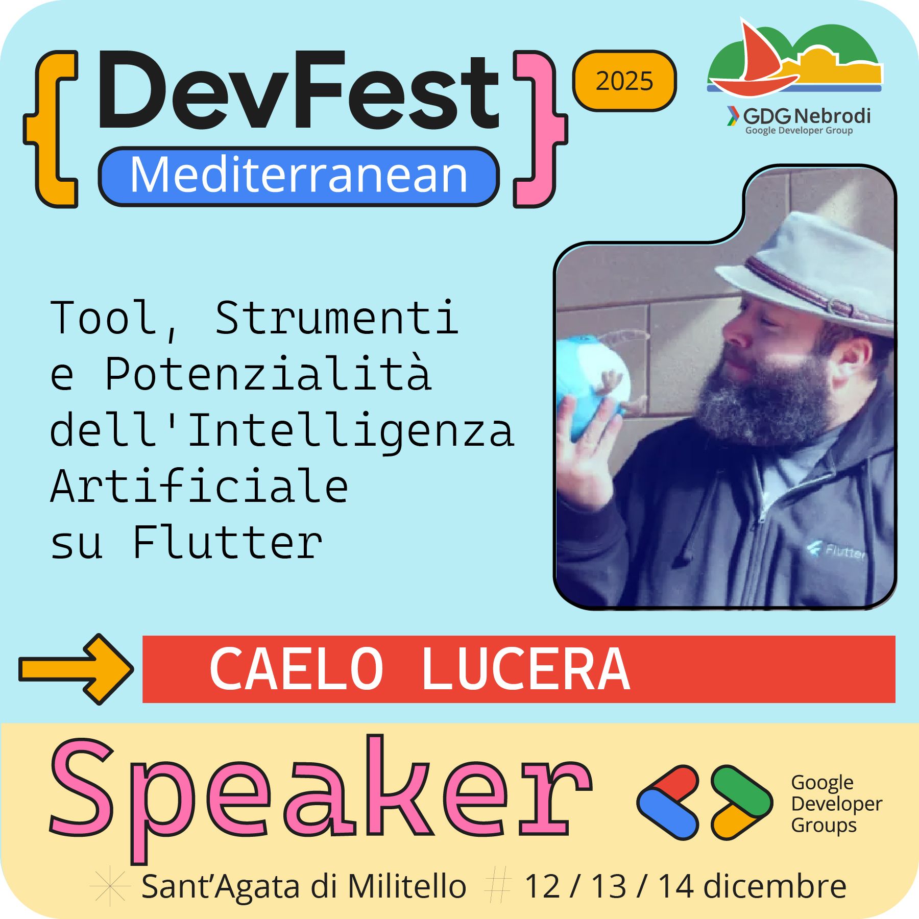 Carlo Lucera (DGE) sarà tra i protagonisti della GDG DevFest Mediterranean 2025 con due talk e un codelab dedicati al mondo Flutter, Firebase e Intelligenza Artificiale.