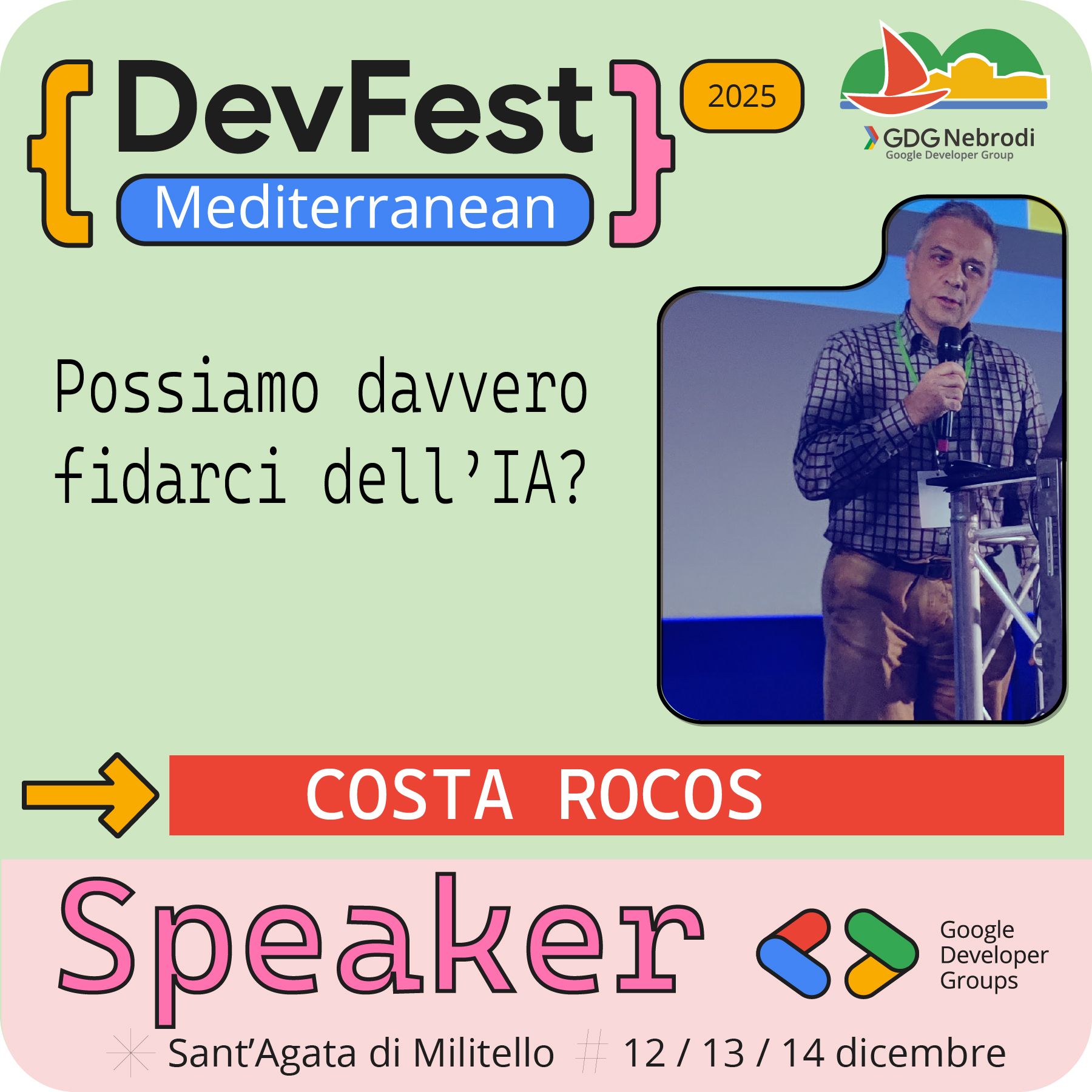 Costa Rocos porterà alla GDG DevFest Mediterranean 2025 un intervento che tocca uno dei temi più discussi di oggi: “Possiamo davvero fidarci dell’IA?”.