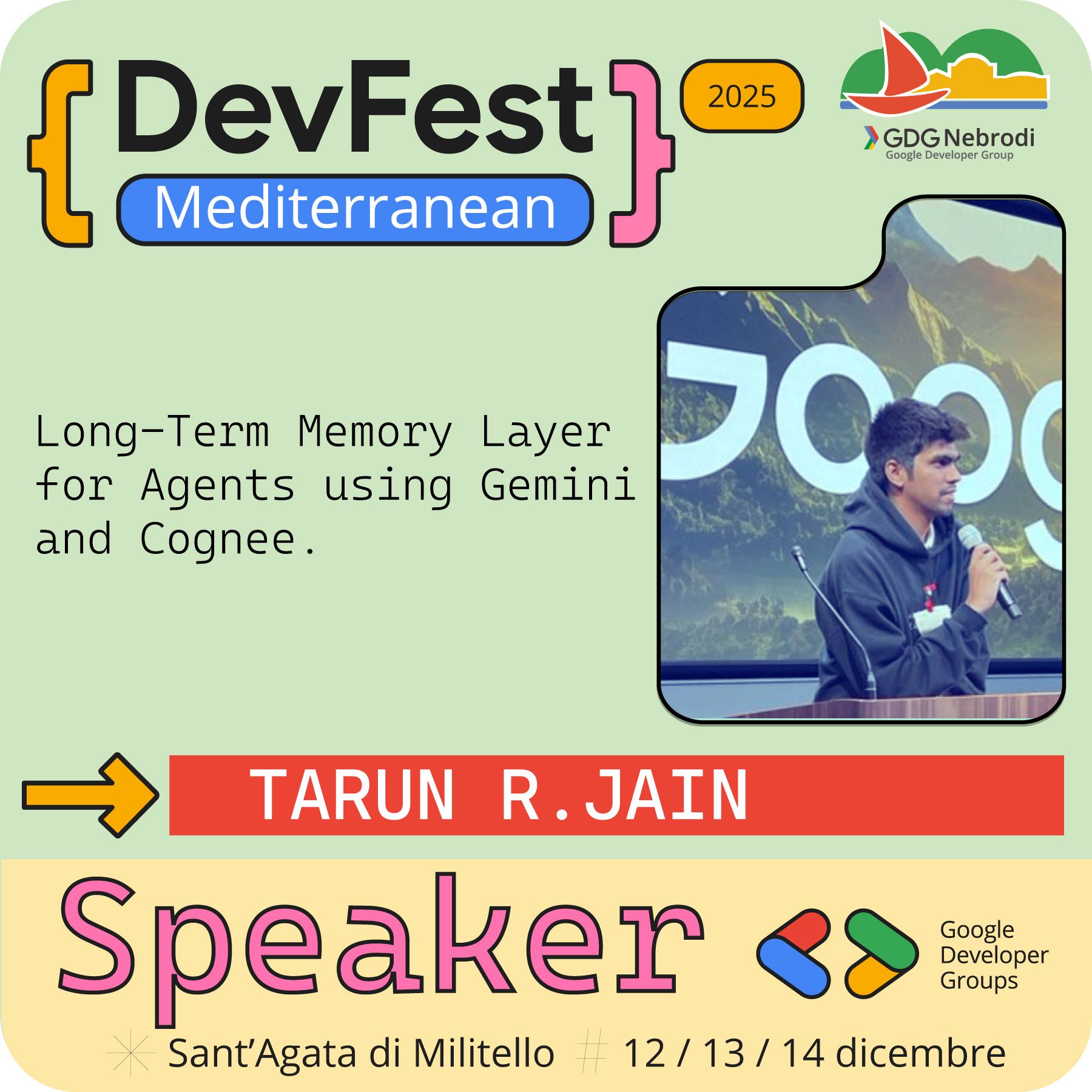 Tarun R. Jain, con “Long-Term Memory Layer for Agents using Gemini and Cognee”. Un talk pensato per chi vuole comprendere come dotare gli agenti AI di memoria avanzata, aprendo nuove possibilità applicative e di automazione.